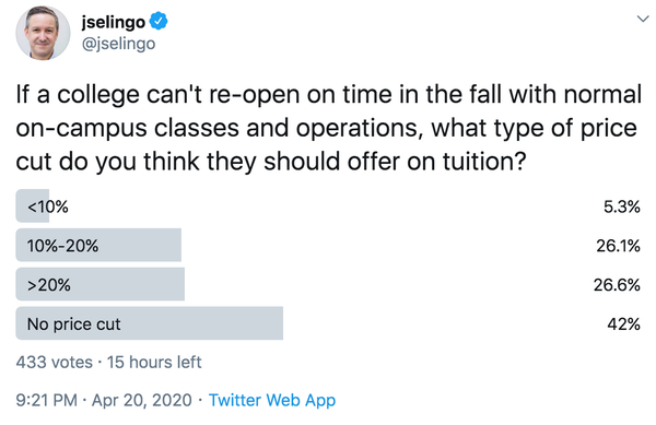 When I posted a poll on Twitter last night, many agreed that there shouldn't be a tuition cut this fall. But on some campuses, students and parents are already clamoring for one, even this spring, as The Washington Post's Nick Anderson recently reported.
