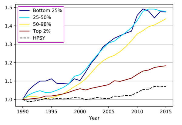The chart above in the paper caught my attention: it shows that for colleges in the bottom 25% of SAT selectivity, enrollment increased by 61% between 1990 and 2015. But the four colleges that appear at the top of the annual U.S. News rankings—Harvard, Princeton, Stanford and Yale (HPSY in the chart)—increased their enrollment by only 7% even as their applications skyrocketed.