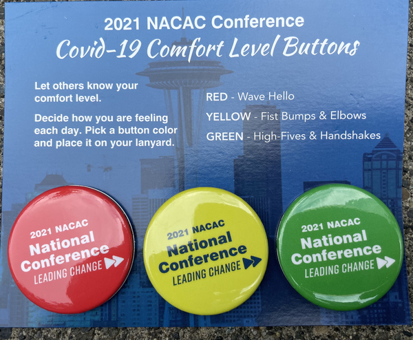 🤝 It was good to be back in person, although the conference presented awkward social moments—do we shake hands, fist bump, or stay six feet away? Thankfully, NACAC provided us nifty buttons to wear to display our preferences (see a picture at the end of the newsletter).
