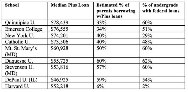- “At nearly 150 colleges, parents typically took out loans worth $50,000 or more, the data show. At more than 500 schools, the median amount they borrowed was between $25,000 and $50,000.”