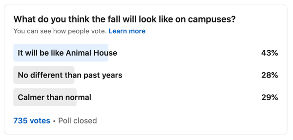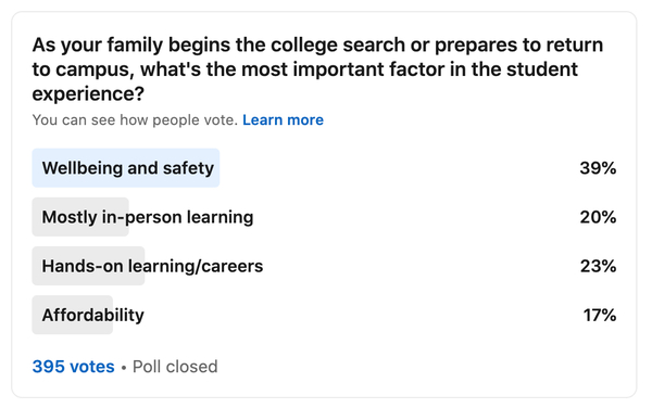 By the numbers: The consequences of college-going students being cooped up with parents and siblings and hitting pause on their social development is still unclear. A very unscientific poll that I took about this question on LinkedIn recently among my 500,000 followers garnered more than 700 responses: